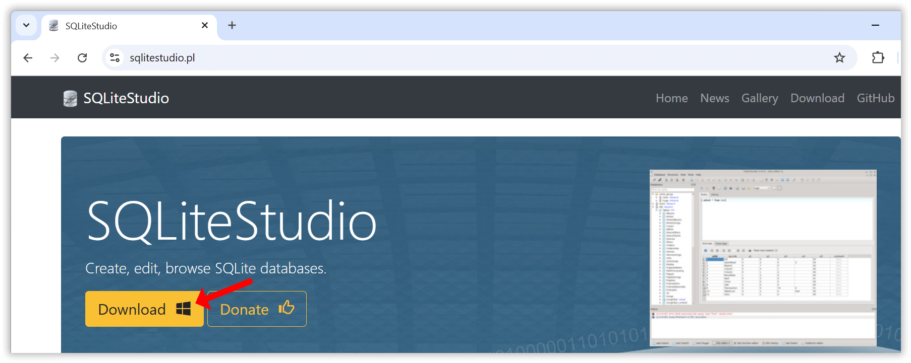 Go to sqlitestudio.pl and click the Download button. SQLiteStudio is free and available for Windows, macOS, and Linux. It comes with SQLite bundled in, so there’s nothing else you need to install.
